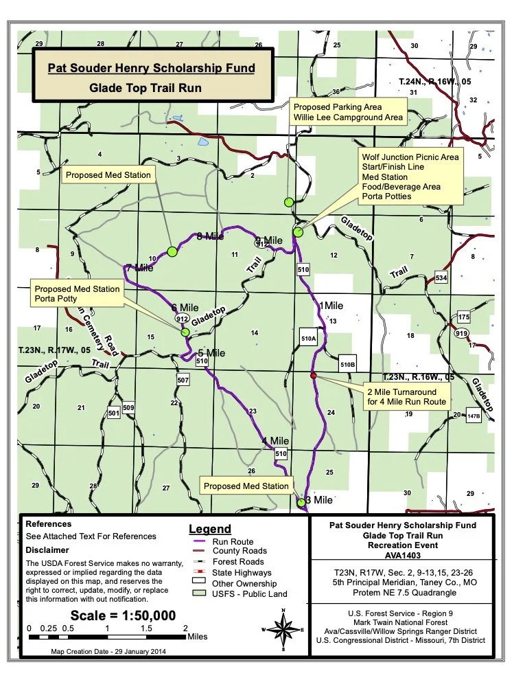10.25 mile trail. Run or hike out ¼ mile, cross the cattle guard, then turn left onto the BEAR trail. Follow pink and green trail tape on the right. There are 2 hard corners. The first is at the bottom of the hill at mile 1.6, turn left; the 2nd hard corner is at mile 1.7, turn right. Cross the creek, pass the 2 mile sign and continue past the turn-around marker, where a water station, medic and photographer are set up. At 3 miles, turn uphill to the right. There is another hard right corner at the 3.6 mile. Run uphill and then at 4 mile it is flat. At 5.1 miles arrive on the gravel road. Turn right and continue 1/4 mile to the PIG trail. There is a medic there, a porta potty and a water jug. At the 6 mile mark it is flat and then goes steep downhill to a creek. A second creek crossing is before the 7 mile sign, then take a hard right at mile 7.1. At the corner there is a big rock hanging in the tree, a big orange arrow, a water jug and a medic. The last water station is at mile 9. At 9.75, runners come out on the gravel road and turn left. Follow the gravel road to the finish line at Wolf Junction.
